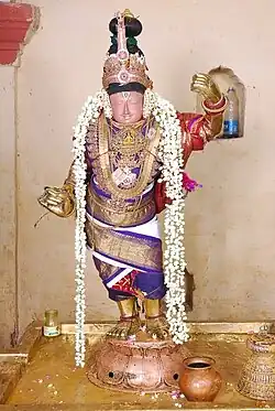 Abhimana Kshethram or Abhimana Sthalam (Devanagari: अभिमान क्षेत्रम् /अभिमान स्थलम्) are a list of 108 sacred Vishnu and Lakshmi temples apart from the other 108 Divya desams. Abhimana desams or close abodes, these temples are the most significant temples in the Vaishnavite tradition which has similar greatness as Divya Desams. These set of temples is classified as an Abhimana Kshethram as it is mentioned in Various Puranas and Ithihasas such as Ramayana and Mahabharata and have Significant Sthala Puranas based on the Ithihasas and Various Puranas of Hinduism . The temples are also said to be visited by many Religious scholars and saints such as Ramanuja, Adi Shankara, Madhvacharya, Nathamuni, Yamunacharya, Vedanta Desika, Manavala Mamunigal, Purandara Dasa, Narayana Teertha, Chaitanya Mahaprabhu and by many other great Vedic teachers and Rishis. Some of these Temples are said to be visited by the Alvars who did not sing the god's grace due to various reasons.[1] Out of these 108 temples Rajagopalaswamy Temple, Mannargudi is considered as the 1st out of the 108 Abhimana Kshethras as Thirumangai Alvar is believed to have visited the temple and is believed to have built the tall flag post outside the temple with the help of cotton bales. The other Alvars who are believed to have visited the temple at various periods were seemingly lost in under the beauty of the presiding deity and were at a loss for words.[1]