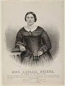 Abigail Becker (née Jackson, 1830 or 1831–1905), known as the Angel of Long Point, was a Canadian farmer and trapper credited with saving the lives of seventeen people across five unique incidents. These included rescuing two individuals who had fallen down separate wells, as well as sailors caught in storms along the shores of Long Point on Lake Erie during three different shipwrecks. She ran a successful farm and raised nineteen children, eleven of her own biological, three step-children, and two more adopted.