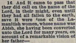 ![]() Alma 19:16, the first mention of Abish in the Book of Mormon | |