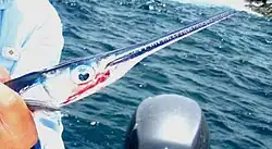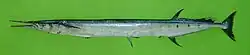 The flat needlefish (Ablennes hians), or barred longtom,[3] the only known member of the genus Ablennes, is a marine fish of the family Belonidae. Flat needlefish are considered gamefish, frequently caught with the help of artificial lights,[4] but are not often eaten because of their green-colored flesh.[5]