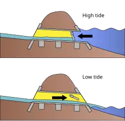 A wooden sluice or aboiteau (plural aboiteaux) is built into the dike, with a hinged door (clapper valve) that swings open at low tide to allow fresh water to drain from the farmland, but swings shut at high tide to prevent salt water from inundating the fields.[1][2] After several years, the rainwater drained from the marsh eliminates the soil's salinity, making it suitable for farming.