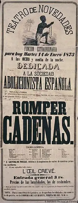 ![]() Poster for a special performance at the Novedades Theatre in Madrid dedicated to the Spanish Abolitionist Society, announcing the premiere of Romper cadenas, a three-act drama by Luis Blanc, presented on January 14, 1873. National Library of Spain. | |