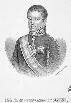 Francisco Arango—who remained in Spain and was appointed by Ferdinand VII to the Council of the Indies—secured a delay in the treaty’s enforcement until 1820. In a plea to the king, endorsed by six other councilors, he argued that "under no circumstances can we agree to an immediate ban on the slave trade" because "the American provinces, in the sad necessity of cultivating their lands with slaves, have no means to replace those who die or are [hanged]," noting that in none of "the estates in America… is the number of females proportionate to males." Thus, "it would abruptly close all sources of prosperity." He also used a blatantly racist argument: "We worry about barbarians without order or civilization who have never used their freedom except to sell or devour each other."[30] In 1834, Arango was awarded the title of Marquess of Gratitude by the regent Maria Christina, who, along with her second husband Agustín Fernando Muñoz, profited from the slave trade and a Cuban sugar plantation worked by slaves.[31]