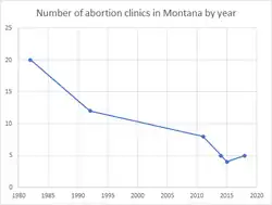 Abortion in Montana is legal until fetal viability (or until full term, if a medical professional deems it important to protect life or health).[1] The number of abortion clinics in Montana has fluctuated over the years, with twenty in 1982, twelve in 1992, eight providers of which seven were clinics in 2011, and five clinics in 2014. There were four clinics from 2015 to February 2018 when All Families Healthcare clinic in Whitefish reopened. There were 1,690 legal abortions in 2014, and 1,611 in 2015.