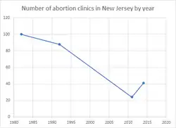 The number of abortion clinics in New Jersey has been on the decline in recent years, going from 100 in 1982 to 88 in 1992 to 41 in 2014. State funding through Medicaid was available for poor women needing abortions, with 10,277 state funded abortions in 2010. There were 24,454 legal abortions performed in 2014, going up to 48,110 abortions in New Jersey in 2017.[29]