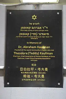 Kaufman's wife also matriculated in medicine at the University of Bern.[13] Kaufman's son Theodore became president of Association of Former Jewish Residents of China, and also the Israel-China Friendship Society. He and Heilongjiang Academy of Social Sciences Professor Qu Wei co-wrote "The Homesick Feeling of the Harbin Jews".[13] Theodore's wife, Rasha Segerman, studied at the Shanghai Jewish School in her youth.