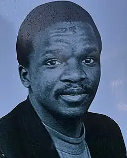 By late 1973 the South African security police were preparing to arrest him.[8] Tiro fled to Botswana, settling at the Roman Catholic Mission in Khale,[8] about 20 km from Gaborone, where he continued to organise for SASO, SASM and the Black Peoples’ Convention, and even forged contacts with the Palestinian Liberation Organisation.[9] While completing an application to study with UNISA,[10] he was handed a parcel bomb—allegedly sent by an agent known only as “Lawrence”—which exploded on 1 February 1974 and killed him instantly.[11] His body was buried in Botswana because the apartheid government refused repatriation. However, the apartheid government proposed for his body to be buried in South Africa if; 1) he can be buried in a steel coffin and; 2) only his family can attend the funeral.[12] Only on 20 March 1998, with support from Azanian People's Organisation (AZAPO) and the Truth and Reconciliation Commission (TRC), were his remains returned to South Africa; he was finally reburied in Dinokana on 22 March 1998.[13] Former Bureau of State Security (BOSS) spy Gordon Winter later revealed that Tiro had been targeted by BOSS’s covert “Z-Squad” unit; the TRC did not formally investigate.[14][15]