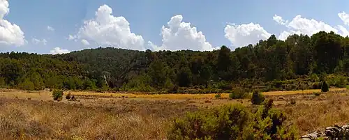 The site is on the left bank of a small ravine, the Barranco de Ahillas; it is a rock shelter between 2 and 9 meters deep, and 38 meters long, facing the northwest.[1] Because of the lack of direct sunshine and its exposure, the site was occupied only from June to October, according to Phytoliths and other evidence, including the reuse and resharpening of stone tools.[2] The area is bordered by two rivers, the Rio Tuejar and the Turia, and two mountain formations, the Sierra de Javalambre (part of the Sistema Ibérico) and the Serra d’Utiel. The site's location, at the entrance of a valley with a dead end, allowed for hunting and trapping large herbivores. The river that (intermittently) runs through the canyon opens onto a plain, and thus the site accessed three different biotopes: the riverside, the mountains, and a plain, so many different kinds of prey could be hunted.[2]