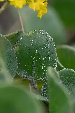 The plant bears attractive neatly rounded heads of small, bright golden flowers. The individual flowers have no petals; rather, they are composed of yellow bracts forming a trumpet-shaped calyx about the stamens. It bears a small, winged fruit. The plant grows in succulent mats on sand or other coastal substrate. The roots are stout, fusiform and often several feet long. These roots are edible, traditionally eaten by the Chinookan peoples.[3] This plant is seen exhibiting psammophory, a method by which plants save themselves from herbivores by attracting sand to their body making them difficult to be eaten.[8] It needs salt water, not fresh water, and will not tolerate extreme drought.[9]