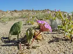 This plant is generally found in sandy, well-drained soil in areas with low precipitation, it can become a striking carpet-like groundcover in undisturbed areas after winter rains. Pink sand verbena tolerates seaside conditions and is found on the west coast of North America from British Columbia, Canada to Baja California, Mexico. Sand verbena is typically found on beaches and sand dunes, below the coastal sage scrub, blooming throughout most of the year.[2][3] It is listed as endangered by the State of Oregon.[4]