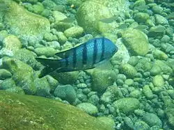 Abudefduf hoefleri,[2] commonly known as the African sergeant, is a species of damselfish in the family Pomacentridae. It is native to the eastern Atlantic Ocean where it ranges from Senegal to Benin, including Cape Verde, Ilhéu das Rolas, and São Tomé Island. It is a littoral species typically encountered in rocky reef environments. The species is oviparous, with individuals forming distinct pairs during breeding and males guarding and aerating eggs. Abudefduf hoefleri reaches 20 cm (7.9 in) in total length.[3]