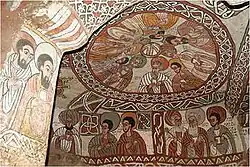 Owing to the dry climate of the church, the paintings on the walls and domes of the church are well-preserved.[11] The design of the traceries in the church replicates those found in nearby churches of Gher'alta, such as Debre Tsion church (which houses more paintings depicting figures from the Old Testament than from the New Testament). The text found in these paintings is written in Geez.