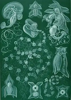 | Bassia bassensis: right = colony, top center = upper bell from above, bottom right = upper bell inside, bottom center = lower bell from below, top right = group of an infertile and a male medusa, bottom left = female medusa | |