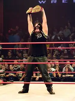 In May 2011, AAA started a storyline, where wrestlers from TNA, led by Jeff Jarrett, announced their intention of taking over the promotion.[112] The first major development of the storyline took place on May 18, when Jarrett and Abyss invaded a AAA event and eventually revealed that they were working together with the heel group La Sociedad, whose leader Dorian Roldán announced his intention of replacing the letters AAA with TNA.[113] Later that same show, Abyss teamed with Jarrett and fellow La Sociedad member Super Crazy in a six-man tag team match, where they were defeated by Dr. Wagner, Jr., Joe Líder and Nicho el Millonario.[114] On June 18 at Triplemanía XIX, Abyss and Mr. Anderson unsuccessfully challenged Extreme Tiger and Jack Evans for the AAA World Tag Team Championship in a steel cage match.[115] On July 20, Abyss teamed with Chessman and Último Gladiador in a six-man tag team match, where they faced Joe Líder, Extreme Tiger and Jack Evans. Abyss won the match for La Sociedad by pinning Líder after Black Hole Slamming him onto a pile of thumbtacks and afterwards also slammed Tiger onto them.[116] This led to a Monster's Ball match on July 31 at Verano de Escándalo, where Chessman defeated Abyss, Líder and Tiger.[117] On September 11, La Sociedad co-leader Konnan announced that on October 9 at Héroes Inmortales, Abyss and Chessman would challenge Extreme Tiger and Jack Evans for the AAA World Tag Team Championship.[118] At the pay-per-view, Abyss and Chessman defeated Tiger and Evans in a Tables, Ladders, and Chairs match to become the new AAA World Tag Team Champions.[119] Abyss and Chessman made their first successful title defense on May 6, 2012, defeated the Mexican Powers (Joe Líder and Juventud Guerrera).[120]
