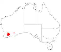 This shrub grows in sandy soil, clay or loam on granite outcrop, hills and plains in disjunct places between Dumbleyung, Lake King and Narembeen, and near the type location, near Sinclair Soak, in the Avon Wheatbelt, Coolgardie and Mallee bioregions in the south-west of Western Australia.[2][3][4]