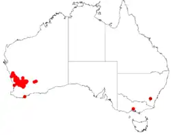 This species of wattle is endemic to an area in the Avon Wheatbelt, Coolgardie, Geraldton Sandplains, Jarrah Forest and Mallee bioregions of south-western Western Australia where it is frequently found along roadsides and on low-lying flats growing in clay, loamy or sandy soils.[8] It is commonly a part of mid-storey of Eucalyptus salmonophloia woodland communities but will also form dense stands in disturbed areas.[4]