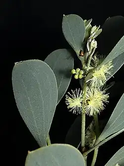 The flowers are usually pale yellow, borne in 1 or 2 cylindrical to oblong spikes 5–15 mm (0.20–0.59 in) long in the axils of phyllodes, each spike with few flowers on a peduncle 1–3 mm (0.039–0.118 in) long. Flowering mainly occurs from October to November, and the fruit is a thin-walled, gently curved or coiled pod, 30–80 mm (1.2–3.1 in) long and 3–6 mm (0.12–0.24 in) wide, containing narrowly elliptic seeds 3.5–5 mm (0.14–0.20 in) long.[2][3][4][5]