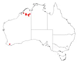 This species of Acacia is endemic to an area in the Kimberley region of Western Australia where it is found in arid barren quartzite ranges[6] or on granite or sandstone slopes as a part of open Eucalyptus brevifolia woodland communities.[3] Early collections were made around Halls Creek and the Ord River.[3]