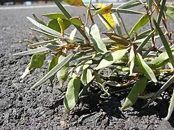 Mulga scrub is distinctive and widespread, with the Mulga Lands of eastern Australia defined as a specific bioregion. The dominant species in these woodlands is mulga, with poplar box (Eucalyptus populnea) forming an increasingly important codominant in the eastern districts.[15][16] The extent of ground cover in mulga woodlands varies with canopy density of the overstorey, becoming almost nonexistent in extremely dense stands. In more open stands, the herbaceous layer consists of wire grasses (Aristida spp.), mulga oats (Monocather sp.), mulga mitchell (Thyridolepis sp.), wanderrie (Eriachne spp.), finger grasses (Digitaria spp.) and love grasses (Eragrostis spp.). Various other woody species are also significant in mulga woodlands, particularly hop bushes (Dodonaea spp.), Eremophila and cassia (Senna spp.).[14][16]