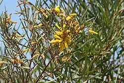 Acacia aprepta, commonly known as Miles mulga,[3] is a species of flowering plant in the family Fabaceae and is endemic to south-eastern Queensland. It is a spreading tree with furrowed bark, linear flat or slightly curved phyllodes, up to 3 spikes of yellow flowers, and linear, papery pods up to about 60 mm (2.4 in) long.