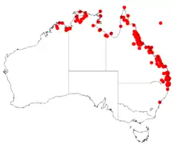 Acacia aulacocarpa has a discontinuous distribution, mainly in coastal areas and nearby tablelands from near Daintree to near Brisbane in Queensland, and near Grafton in New South Wales. It grows in clay or loam along watercourses, in sandy soil on rocky outcrops in forest and shrubland[6][7] or in woodland on sandstone.[4]