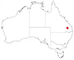 Waajie wattle is restricted to the Barakula State Forest north of Chinchilla, where it grows in sandy soils in eucalypt communities.[2][4]