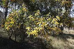 Acacia blakei, commonly known as Blake's wattle or Wollomombi wattle,[2] is a species of flowering plant in the family Fabaceae and is endemic to eastern Australia. It is an erect or spreading tree or shrub, with straight or curved phyllodes, yellow, pale yellow or cream-coloured flowers arranged in cylindrical heads in up to three axils, and straight to curved, firmly papery to thinly leathery pods.