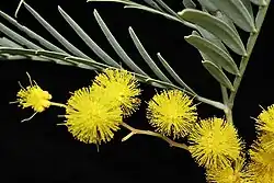 The flowers are borne in axils or on the ends of branches in panicles of spherical heads on peduncles 3–5 mm (0.12–0.20 in) long, each head 5–9 mm (0.20–0.35 in) in diameter with 12 to 30 bright yellow to golden-yellow flowers. Flowering occurs in spring between September and October and the pods are straight or slightly curved, brown, bluish or purplish brown, 40–115 mm (1.6–4.5 in) long and 7–11 mm (0.28–0.43 in) wide and are fully developed between November and December.[3][5][6][7]