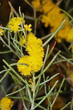 Acacia brachypoda is a dense, rounded, slightly aromatic shrub that typically grows to 1–3 m (3 ft 3 in – 9 ft 10 in) high and 1–4 m (3 ft 3 in – 13 ft 1 in) wide with sticky new shoots flowers and pods broad, flat branchlets. Its phyllodes are spreading to erect, terete to flat and linear, 20–50 mm (0.79–1.97 in) long and 0.7–1.4 mm (0.028–0.055 in) wide with four obscure veins. The flowers are borne in two spherical heads in axils on peduncles 2–3 mm (0.079–0.118 in) long, each head with 8 or 9 golden-yellow flowers. Flowering occurs from about May, and the pods are curved, wavy, to irregularly coiled, 7–8 mm (0.28–0.31 in) wide, thinly leathery to crust-like, containing oblong seeds about 4 mm (0.16 in) long with a thick, yellow-brown aril.[3][4][5][6][7]