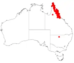This species of wattle is endemic to Queensland where it grows in shallow, rocky soils or sand in open forest, woodland, heath or scrub, often on steep hillsides in coastal areas from the Cape York Peninsula down to around Townsville in the south.[2][3]