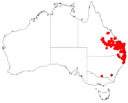 Flat-stemmed wattle is widely distributed throughout south-eastern Queensland from around Jericho in the west to around Bundaberg in the east and is also found as far southwest as the Dumaresq River in New South Wales and down the north coast to around Coffs Harbour, New South Wales. It is grows on low ridges in gravelly, sandy to loamy soils, often over sandstone, and usually in heathland or dry sclerophyll forest.[4] It also occurs in a disjunct population near Torrington.[2]