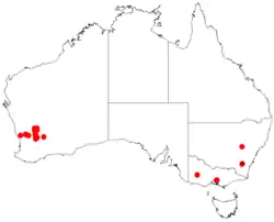 Sandpaper wattle is found in eight scattered populations over a range of 180 km (110 mi) in the Merredin district in the Western Australian Wheatbelt northeast of Perth, over an area roughly bounded by Nungarin in the south, Wongan Hills in the west and east of Mount Churchman in the east.[1] It generally grows on or near granite outcrops, and occasionally on sandplains, or a range of soils such as silt, clay, loam or sand.[7]