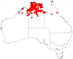 It is native to an area in the Kimberley region of Western Australia,[1] to the top end of the Northern Territory, and north-west Queensland.[3] It is quite common in the northern parts of the Northern Territory and is also found on Thursday Island and Melville Island, it is much rarer in Western Australia where it is found around Kununurra and is also found near the Gulf of Carpentaria in Queensland. It is usually situated along creeks growing in sandy or gravelly soils as a part of open woodland communities where it is often associated with Eucalyptus tetrodonta.[2]