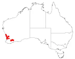 It is native to an area in the Wheatbelt and Peel regions of Western Australia where it is commonly situated in low lying areas growing in gravelly or sandy soils.[1] The range of the plant extends from around Eneabba in the north down to around Mundijong in the south and out to around also Wongan Hills and Newdegate in the east.[2]