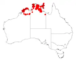 It is found in the Kimberley region of Western Australia[2] and in the Northern Territory from Melville Island in the north, south to Kakadu National Park. Usually it is found among sandstone outcrops and ranges and along rocky watercourses in sandy soils in open Eucalypt or mixed woodland communities sometimes it is associated with Melaleuca nervosa.[3]