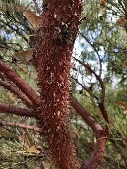 Miniritchie grows is a shrubby tree to a height of 1 to 6 m (3 ft 3 in to 19 ft 8 in)[1] and a width of 3 to 5 m (9.8 to 16.4 ft)[3] and has a many branched, rounded or flat topped habit.[1] It typically has several main stems. These are often twisted, and are always covered in distinctive red to brown coloured minni ritchi bark,[3] which peels in small curly flakes. Like most Acacia species, it has phyllodes rather than true leaves. These are rigid, round in cross-section with a diameter of about a millimetre, and up to nine centimetres long. It blooms between May and October[1] and produces yellow coloured flowers that are held in cylindrical clusters about three centimetres long and five millimetres in diameter, on stalks about two centimetres long. The pods are brown, up to eleven centimetres long, with tight constrictions between the seeds.