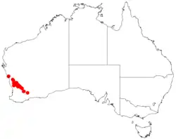 It is native to an area in the Mid West and Wheatbelt regions of Western Australia where it is found on sandplains and lateritic hills and rises growing in gravelly sandy or loamy soils.[1] The disjunct distribution is from around Geraldton in the north west down to around Hyden in the south east where it is often part of shrubland or Eucalyptus woodland communities.[2]