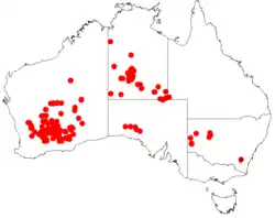 It is native to the Northern Territory and now found in an area in the Wheatbelt and Goldfields-Esperance regions of Western Australia.[3] It is also native to New South Wales and South Australia,[1] and to far south-western Queensland.[5]