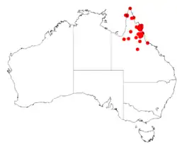 It has a scattered distribution over the Cape York Peninsula of Far North Queensland down to around Herberton in the south where it is commonly situated on hills and along creeks growing in sandy soils.[2] The plant is quite common around the Irvinebank area.[1]