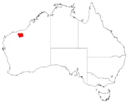 It is native to a small area in the Pilbara region of Western Australia north of Newman[1] and south of Marble Bar[2] where it is often situated on hilltops and hillslopes growing in sandy or loamy soils over granite[1] usually as a part of scrubland and spinifex communities and it is often associated with Acacia hilliana and Acacia stellaticeps.[2]