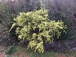 The dense pungent shrub typically grows to a height of 0.5 to 3.0 metres (1.6 to 9.8 ft) and produces yellow flowers from August to November.[4] It has glabrous but prominently ribbed branchlets. The green, pungent and somewhat crowded phyllodes are ascending on the branchlets. They have an interesting obtriangular to obdeltate shape resembling a sharks tooth. The phyllodes are 7 to 17 millimetres (0.28 to 0.67 in) long and 5 to 15 mm (0.20 to 0.59 in) and sometimes larger. The simple inflorescences have globular heads containing 8 to 15 pale-yellow flowers. After flowering blackish to yellowish linear to curved seed pods that are around 6 centimetres (2.4 in) in length with a width of 2.5 to 3 mm (0.10 to 0.12 in). The pods contain shiny brown oblong seeds arranged longitudinally which are 2.5 to 3 mm (0.10 to 0.12 in) long.[5]