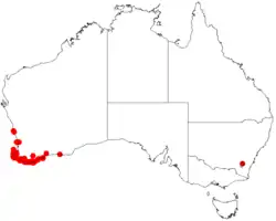 It is native to an area in the South West, Great Southern and Peel regions of Western Australia.[4] The bulk of the population is found from Busselton east to Bremer Bay. An isolated population is found on Rottnest Island.[5] A. littorea grows mostly on coastal dunes in deep sandy soils and in limestone area.[4] It is commonly found in heath land communities and can be a dominant species.[5]