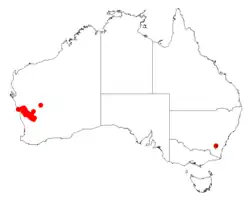 It is native to the Mid West and Wheatbelt regions of Western Australia where it is found on undulating plains and among granite outcrops growing in sandy or loamy gravel soils.[2] It occupies an area from around Geraldton in the north to Yalgoo in the east and south to around Bencubbin and is usually associated with low Eucalyptus woodland communities.[1]