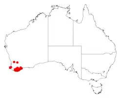 It is native to an area in the South West and Great Southern regions of Western Australia where it is commonly situated in low lying areas.[1] The bulk of the population is found from Mount Barker to the Stirling Range in the north down to around Albany to the Beaufort Inlet in the south where it grows in sandy to sandy clay and loamy soils in seasonal swamps as a part of mallee or woodland and communities.[2]