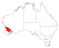 It is native to an area in the Mid West, Wheatbelt, Great Southern and Goldfields-Esperance regions of Western Australia where it is commonly situated on rocky rises, breakaways, and undulating sandplain growing in sandy, loamy or loam-clay soils often over and around laterite or granite.[1] The bulk of the population is found between Coorow in the north west down to around Corrigin, Western Australia and Moorine Rock in the south east with outlying populations found near Mullewa, Ongerup, Ravensthorpe and the Frank Hann National Park.[2]