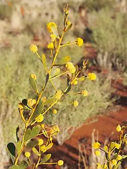The V-shaped or rounded[1] glabrous and resinous[5] shrub typically grows to a height of 1.0 to 4.0 metres (3.3 to 13.1 ft) with the stem dividing at ground level into many spreading-erect generally straight main stems forming a sparse to mid-density the crown. The bark is rough and dark grey at base of older stems otherwise smooth and light grey.[1] The branchlets are tuberculate.[5] It has stiff straight dull grey-green phyllodes that are 3 to 4.5 centimetres (1.2 to 1.8 in) in length and 5 to 10 millimetres (0.197 to 0.394 in) wide.[7] The phyllodes have an obovate to oblanceolate or narrowly oblong-elliptic shape with two or three prominent longitudinal nerves.[1] It produces yellow flowers from May to September.[7] The simple flower-spike has one to three globular shaped golden flower-heads per axil.[1] Each flower-head has a diameter of 5 to 8 mm (0.197 to 0.315 in) contains 30 to 40 individual flowers.[5] The flowers have a distinctive honey-like odour.[3][2] After flowering brown and narrowly oblong seed pods form that are up to a length of 9 cm (3.5 in) and a width of 1.5 cm (0.59 in) and contain dark brown ovoid shaped hard seeds that are about 4 mm (0.157 in) in length and 2.5 mm (0.098 in) wide.[2]