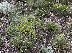 The spindly open shrub typically grows to a height of 1.5 to 3 metres (5 to 10 ft)[3] and has glabrous branchlets that can be covered in a fine white powdery coating toward the extremities and have scarring along the length by the by raised stem-projections where phyllodes once were located. Like most species of Acacia it has phyllodes rather than true leaves. The rigid, pungent, glabrous grey-green phyllodes are erect with a cylindrical shape and are straight to slightly curved. The phyllodes have a length of 1.5 to 5 cm (0.59 to 1.97 in) and a diameter of about 1 mm (0.039 in) with seven smooth longitudinal nerves.[4] It blooms in August and produces yellow flowers.[3] The inflorescences occur singly or in pairs on a raceme that is about 0.5 mm (0.020 in) in length. The obloid shaped flower-heads are 7 to 10 mm (0.28 to 0.39 in) in length and contain about 25 golden coloured flowers. The thinly leathery, glabrous seed pods that form after flowering have a powdery white coating with a linear shape but are raised over each of the seeds on alternating sides. The pods are up to 7 cm (2.8 in) in length and about 4 mm (0.16 in) wide and contain glossy black seeds with an elliptic shape that are 3 to 4 mm (0.12 to 0.16 in) long with a yellow coloured aril.[4]