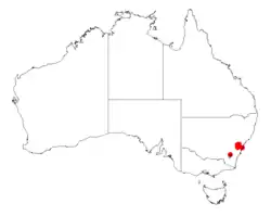 It has a limited distribution within the Blue Mountains of New South Wales from around Woodford in the south to around Mount Victoria in the north. It is often situated in swampy areas and damp places along creeks[1] over or around areas of sandstone.[2]
