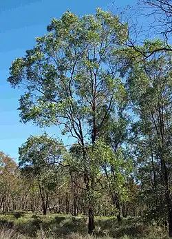 It is endemic along the east coast of central Queensland where it is found from around Eidsvold in the south to around Clermont in the north with another disjunct population near Mount Garnett further north where it is a part of Eucalyptus woodland communities.[1] It is often situated in hilly areas or undulating plains in the eastern part of the brigalow belt where it grows in skeletal sandy to clay soils with poor fertility where it is a part of open forest.[3]