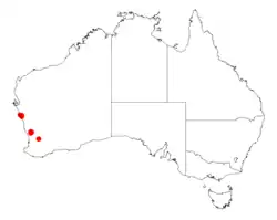 It has a disjunct and scattered distribution through the Wheatbelt and Mid West regions of Western Australia where it is found growing in clay, loamy or sandy soils.[1] The range of the plant extends from the Murchison River in the north down to Northampton in the south with another population found further south near Mogumber Nature Reserve usually as a part of heathland communities.[2]